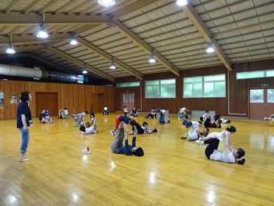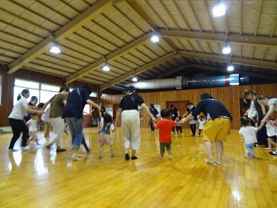 この日は台風21号による雨。午前中はまだ雨風も強くなかったので、無理はせず来られる方だけ集まりました。それでも18組の親子が集まり、親子体操など音楽に合わせて体を動かして遊びました。