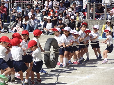 年長さんの団体競技は「つなひき」。みんな力が入りました。