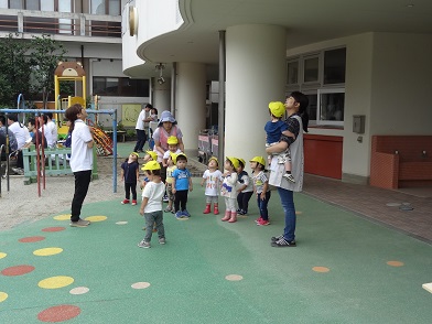 総練習の日、1歳児さんもはとぽっぽ体操を見ながらまねっこしていました。