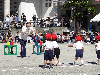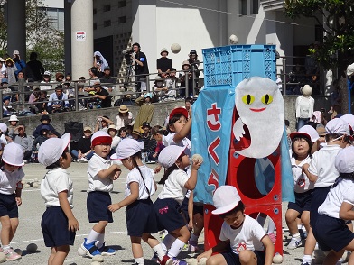 年少さんの団体競技。玉入れの要領でクラス対抗をしました。