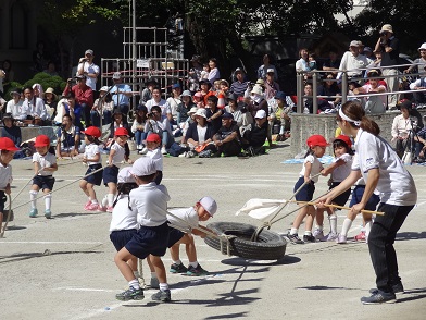 年中さんの団体競技。赤ネズミと白ネズミがドーナツに見立てた9個のタイヤを奪い合いました。素早さと力と最後まであきらめない気持ちが勝負を決めました。