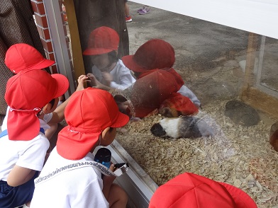 「かわいいー」「ふわふわしてる」モルモットに釘付け。なかなか動かないのは子どもたち。