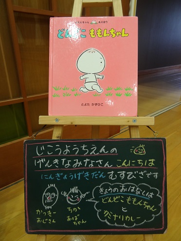 「どんどこももんちゃん」は小さな子どもたちも親しんでいる絵本のお話。いちごさん・ちゅーりっぷさん・たんぽぽさんも楽しく見ました。