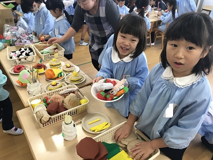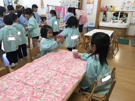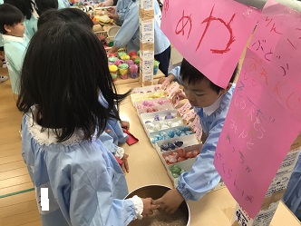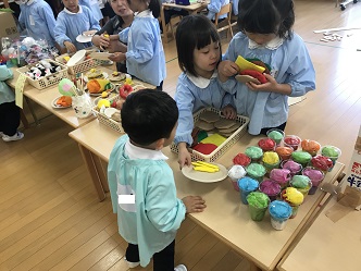 好きなものを選んで、イートインコーナーで・・・。年長さんとのやりとりに少し緊張しても、手に入れたジュースをお友だちと飲む真似で満足感や楽しさがこみ上げてきます。「楽しいね」「次は何にする?」次の楽しみにつながっていきます。
