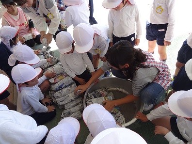 前日に掘ってきたサツマイモを年長さんが一つずつ新聞紙で包んでくれ、他の学年の子どもたちにも分けてくれました。