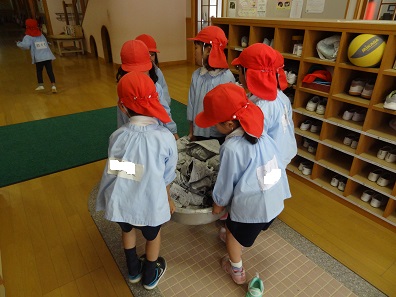 一人一つずつの大きなサツマイモをもらい、「大きい組さん ありがとう」「大きい組さんて、すごいね。」と小さな子どもたちが言っていましたよ。
