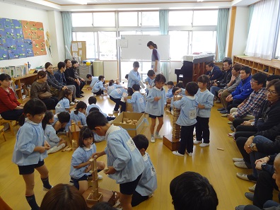 年長さんは、はじめはリズム遊び。その後は友達と一緒に考えたり協力したりして、木片であそびを作っていく過程を見ていただきました。何を作るか、何にしていくかはそれぞれのグループが相談して決め、それぞれがあそびや形にしていきました。