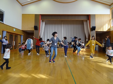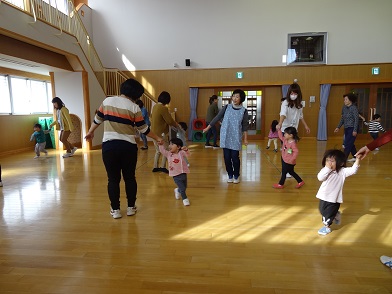 音楽に乗って、先生の声を聞いて、お母さんと一緒に、まねっこをしながら…