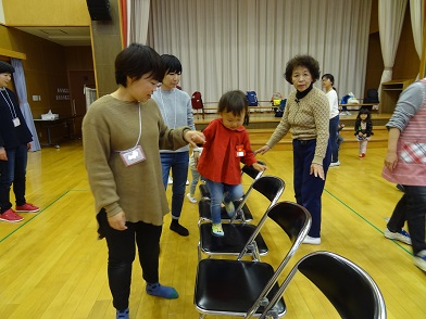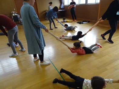 タオルや椅子を使って遊びました。しっかりつかむこと、少し高いところでもバランスをとりながら足を上げていくことなど、遊びの中で運動しました。