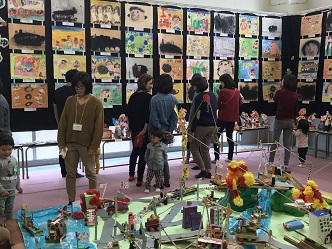 おやつの後は、園児たちの作品展を見に行きました。さくらんぼの小さなお友だちも、お兄さん・お姉さんたちの描いた絵、作ったものにとても興味を持って見てくれました。