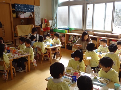 クラスの誕生会の後は給食。配膳をして下さる「おかあさん先生」。一緒に給食をいただき、食後の遊びの時間も子どもたちとかかわって遊んでいただきました。