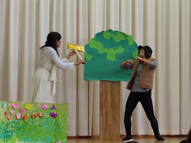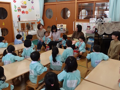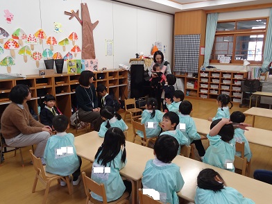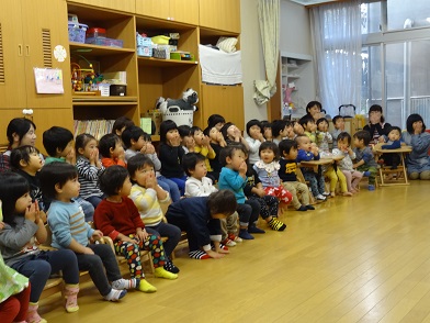 アトラクションの劇「金の斧」を楽しんだ後、各クラスでのお誕生会に分かれました。お母さん方が「先生」となり、クラスの子どもたちにお話をして下さいます。