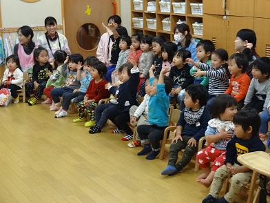 子どもたちはアトラクションが大好き。手振り、身振りで反応しながらパネルシアターを楽しんでいました。