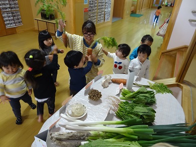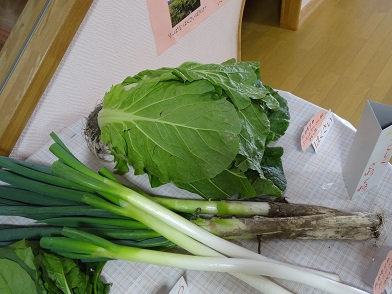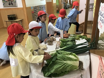 土の中から抜き取ってきたばかりというようなにんじんや長ネギ、根の付いた白菜などに子どもたちは興味津々。