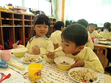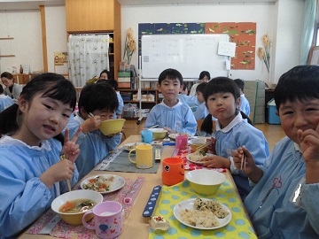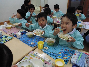 おかずの量が増えた年中さんも年長さんも、「みんなで食べるとおいしいね。」と、ぱくぱく食べていましたよ。