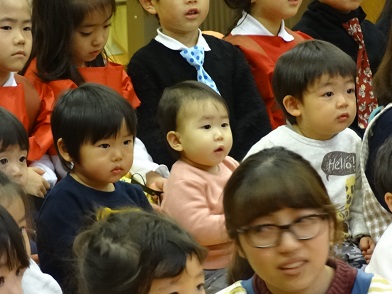 総練習でも見ることができた2歳さんたちは2回目。さらに興味深く見ていたようです。年長さんは小さなお友だちにも分かるように、はっきりゆっくりお話ししてあげられたかな?