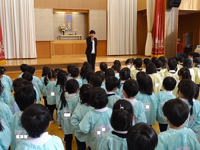 長かった2学期を夏の頃から振り返り、いろいろなことを体験し楽しかったことを思い出しました。「年末年始、大勢の人に出会う機会が増えるので、きちんと挨拶をしようね」「寒さに負けず、元気に過ごしましょうね」などの話を聞きました。