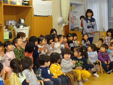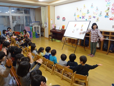 未満児さんの集会。2歳さんたちが楽しそうに、上手にお返事してくれると、小さなお友だちも関心を持って、見て聞いてくれます。
