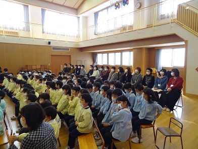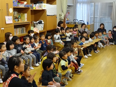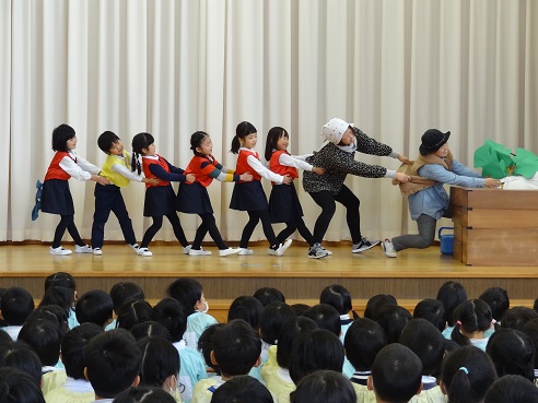 保護者にも来ていただいて、みんなでお祝い。アトラクションは年中の先生の「おおきなかぶ」。年長の誕生者6人も劇に加わりました。さすが年長さん、朝のちょっとした時間での打ち合わせでとても上手に演じてくれました。