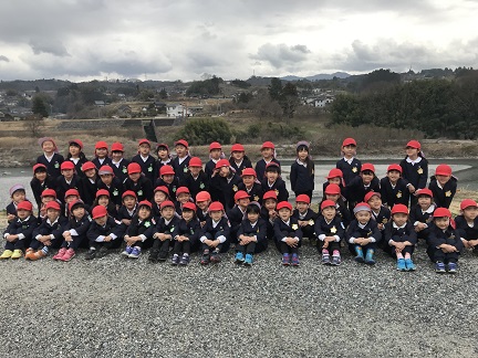 「天竜川の河原に行って石を拾ってこよう」中村先生の後をついて行きました。天竜川を背にみんなで記念写真。