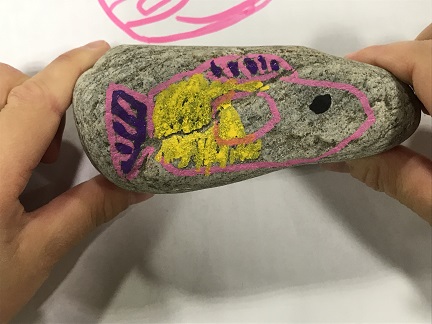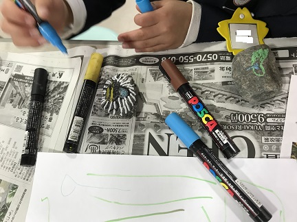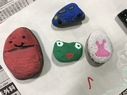 「石ころアート」石に絵を描きました。石の形からイメージしたり、好きなものを描いたり、思い思いに楽しんでいたようです。