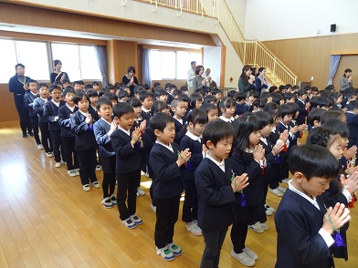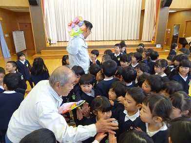 今年度をもってご退職なさる事務長の麦島先生、用務員の小林先生にも「ありがとうございました」と手作りのお花のプレゼントがありました。子どもたちの陰に日向にお世話いただき、子どもたちも慕っている存在でした。