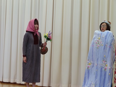 ↓真剣な目で見ている先は・・・ 年長、年中の職員による「あかずきんちゃん」の劇。