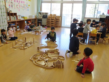 別の保育室では、既に保育が始まっています。皆、1つ大きくなって、新しいお部屋になったけれども、