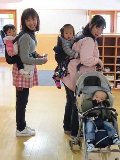 ↑ たんぽぽさん、散歩車で園庭をお散歩中。↑つくしさんは3人でのスタートです。
