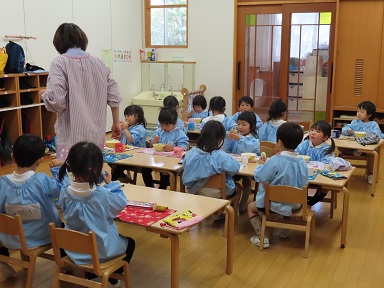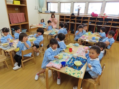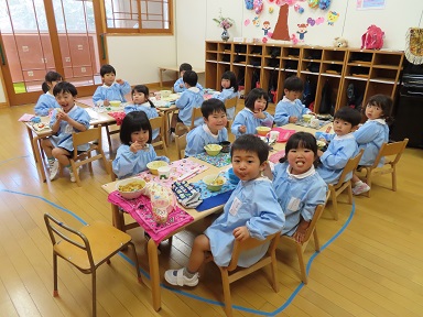 今日からいよいよ年少さんは皆一緒に給食を食べ始めました。