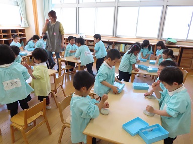 年中さんは、新しい粘土で遊んでいました。年少さんの時とは違う、ちょっと固い油粘土です。立ち上がって力一杯叩きながら形を変える面白さを味わっていました。