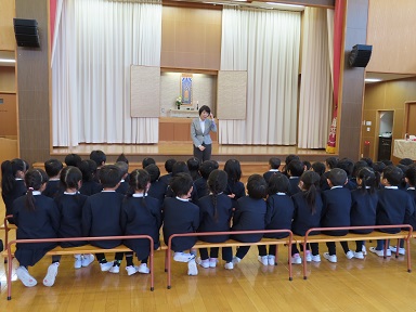 今日は年長さんは、初めての園長講話がありました。のの様にお参りをして、園長先生のお話を静かに聞きました。
