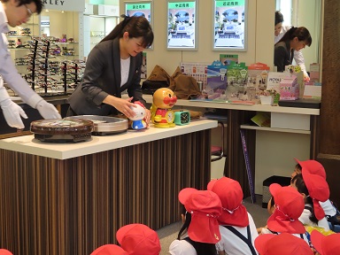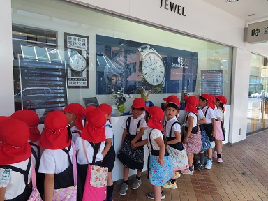 店員のお姉さんがいろいろな時計を教えてくれました。砂時計に花時計、水時計に観覧車の時計。時の記念日が6月10日になったのは、天智天皇の時代、日本で初めて水時計の鐘が鳴ったのが6月10日だったからだそうです。年長さんにはちょーっと難しかったね。でも、その後にはからくり時計を見せてもらったり、キャラクター目覚まし時計のクイズを出してもらったり、興味津々で楽しく見せて頂きました。