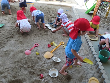 昨日は飯田の最高気温も30度を超え、真夏日も多くなってきました。2歳児さん達は裸足で砂場に出て気持ちよさそうです。お片付けをした後は、冷た~いお水で足を洗って、何とも嬉しそうでした。早く水遊びしたいね!
