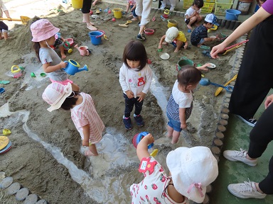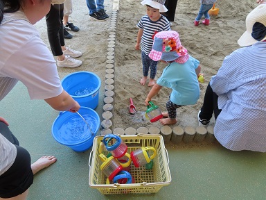 早速ジョウロを使って砂場にジャジャジャジャー。水を流し込んで遊び始めました。お母さん達も加わって、長ーい川ができましたよ。冷た~い水の気持ちよさをピチャピチャと味わっていました。裸足になる事に抵抗があるお友達、汚れることを嫌がるお友達、焦らなくていいですよ!お友達が遊んでいる様子を見ながら、「ちょっと楽しそうだな・・・」ときっと感じていたと思います。その思いが、徐々に裸足になって大胆に遊べるようになる”芽”となるのだと思います。焦らず、少しずつ、楽しめることを増やして行きましょうね。