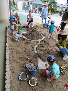 こちらは、12日の様子。ゆったりゆっくり6組のさくらんぼさんの親子が楽しみました。大きなお山と、お山の周りに丸い川ができました。お山の下にトンネルを掘ってトンネルにも水を流して遊んでいるお母さんとお友達もいました。あらら、おしりまで水に浸かって、嬉しそうなお友達もいましたよ!