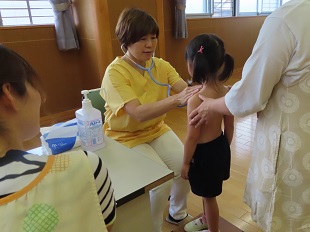 この他、年長さんは視力検査、2歳児以上を対象に尿検査も行いました。健康診断をきっかけに、自分の体に関心を持ち、健康に生活すること、大きくなる事に喜びを感じられたらと思います。