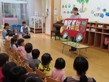 6月生まれのお友達、おめでとうございます。今月は、4人の未満児さんと16人の以上児さんがお誕生日を迎えました。未満児さんも1人ずつきちんとお礼が言えましたよ!未満児さんのお誕生会のアトラクションは『おべんとバス』。たくさんの美味しそうなものが集まってきておべんとバスができあがり!終わった後には「たのしかった~」とのかわいい声が聞こえてきました。
