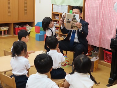 年長さんは今回はお誕生者が1人。誕生者のいないお部屋では、先生のお名前の由来を聞きました。日本地図を見ながらの説明に興味をもって聞き入っていました。