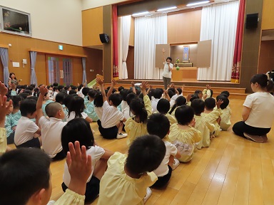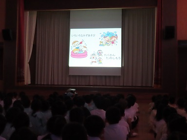集会では、園長先生のお話をお聞きし、みんなとプールで楽しく遊ぶためのお約束のスライドを見ました。