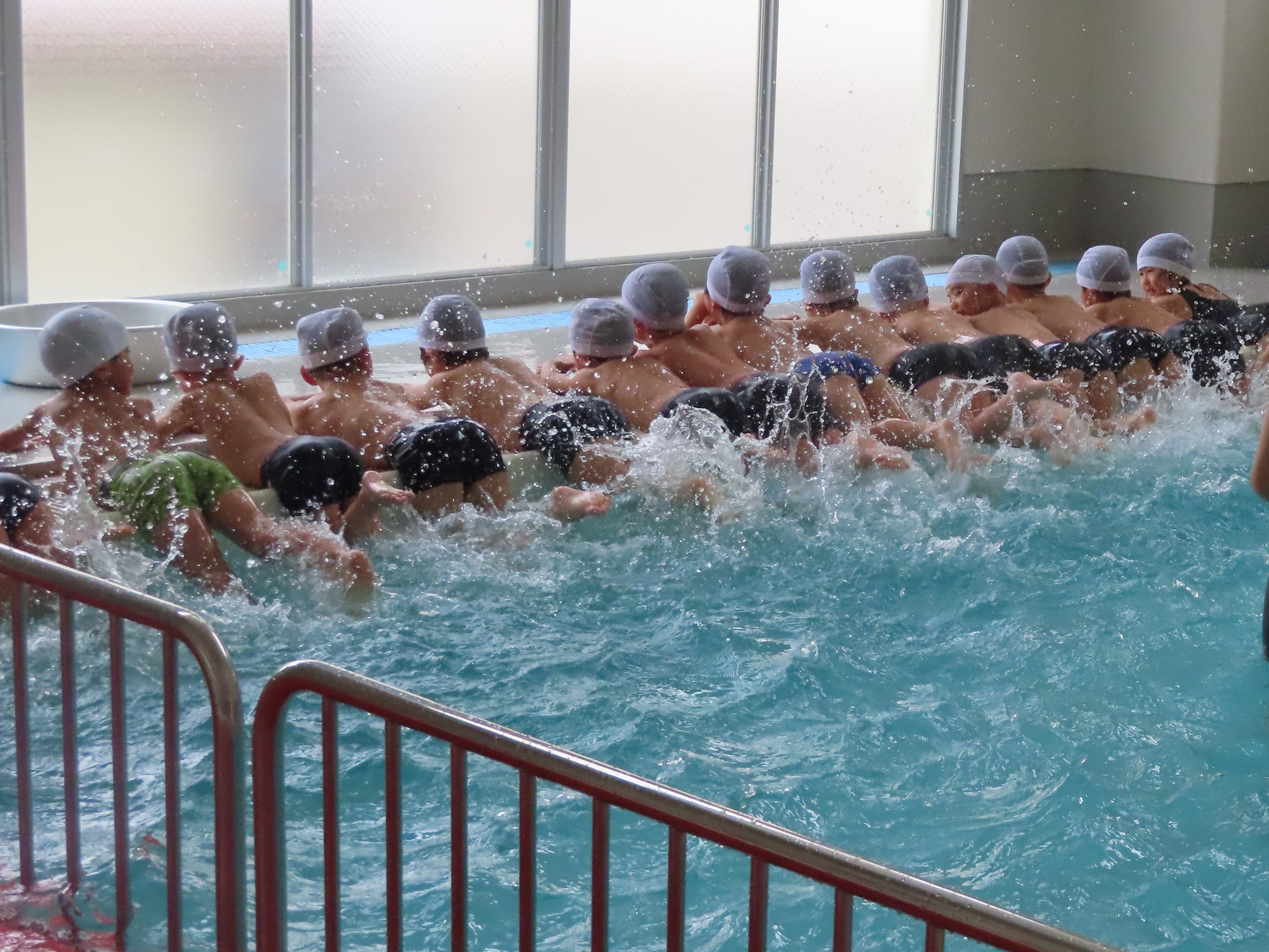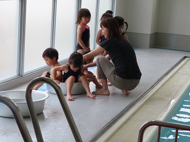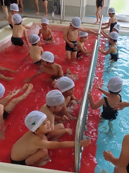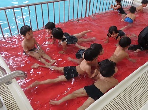 その後には、クラス毎に順番にプールへ・・・。年少さんは初めてのプール。足もおしりもお約束通り消毒して、いざプールに。初めてにもかかわらず、水が顔にかかったと言って泣くお友達もなく、のびのびと水に親しんでいました。手をついて、ワニさんになるお友達もいましたよ!これからも元気いっぱい遊ぼうね。