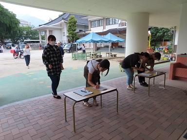 メールを確認した保護者から、徐々にお迎えに来てくださいました。お迎えに来た方は「お迎えに来た時間」「誰が来たのか」を名簿に書き込みます。
