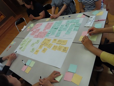 グループでの話では、子どもの「良いところ」「課題に思うところ」「原因 どうしてそうなってしまうのかな」「改善方法 ではどうすれば良いのかな」を4色の付箋に書き込み、自分の考えを出し合いました。4色の内、枚数が少なかったのは・・・「改善方法」。日々の忙しい生活の中では、中々「どうしたらよいか」とゆっくり考えて対応することが難しいですね。最後にはどのようにすれば改善されるかを難度毎に出し合い、まとめをしました。