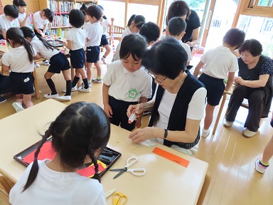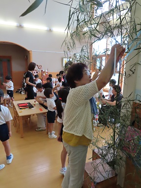 地域の方をお招きして、賑やかに、そして笹に囲まれて清々しい雰囲気の中、たなばたまつりを行いました。年長さんは地域の方と一緒に笹飾りを作り、触れ合いを楽しみました。