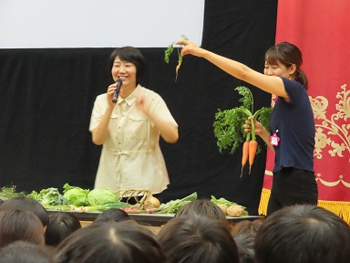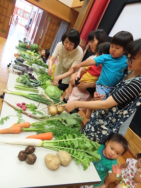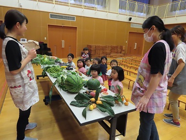 以上児の集会では、園長先生に野菜を見せてもらいながら、それぞれの特徴を教えていただきました。「びわ」の時期ですが、びわを知らないお友だちが大勢いました。以前は給食のデザートでびわがでることがありましたが、最近は種が危ないということで、給食では出せなくなってしまいました。残念。