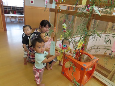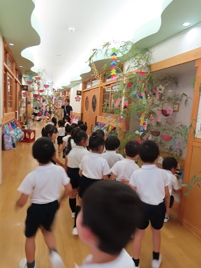 集会の後には、皆で他学年の七夕飾りを見て園内のお散歩を楽しみました。0,1歳児のつくしさんも、いろいろな場所に飾られている笹飾りを見て回りました。