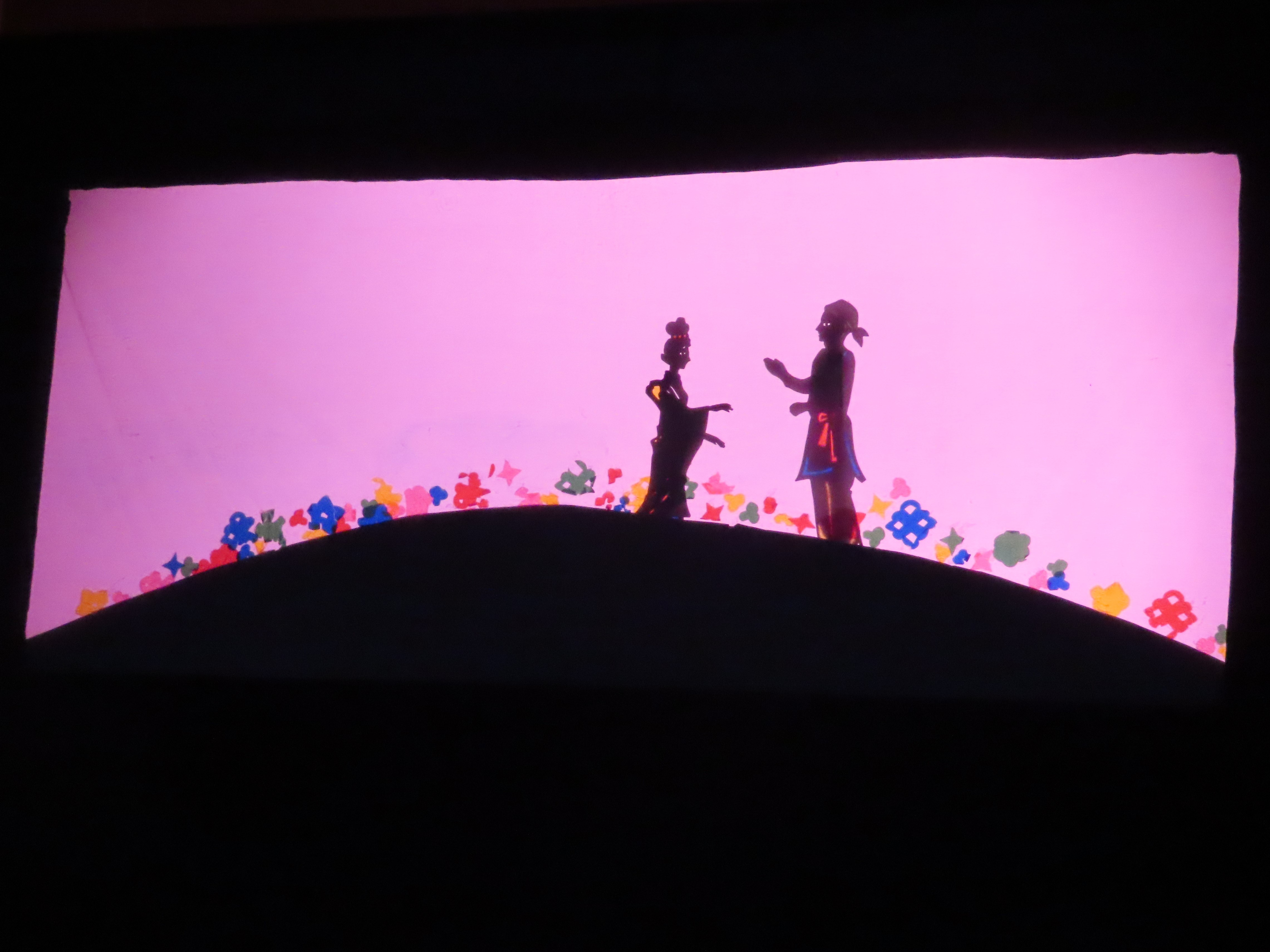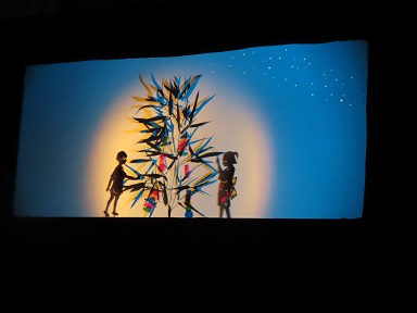 集会の最後には、職員による『たんばたさま』の影絵の上演がありました。きれいな色とりどりの光と影によるお話でした。