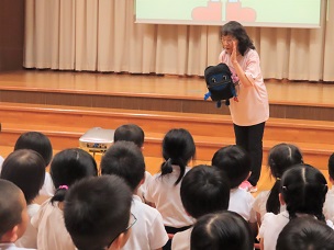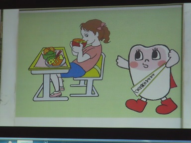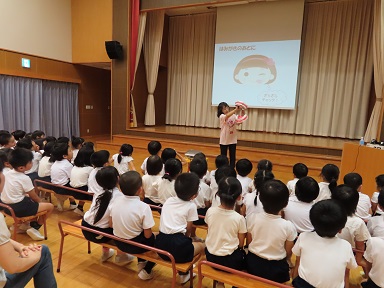今日は、飯田女子短期大学から、安富先生が噛むことの大切さや、虫歯について、虫歯にならない歯磨きの仕方について、紙芝居で分かり易く教えていただきました。