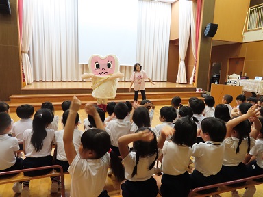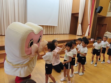 最後には、本物のカミンちゃんが登場!! カミカミパワーをいっぱい分けてもらいました! その後の給食には、ソフトフランスパンが出ました。年長さんは、よく噛んでいただき、その後の歯磨きも真面目に行っていたとのこと・・・。ミュータンスは要らないね。