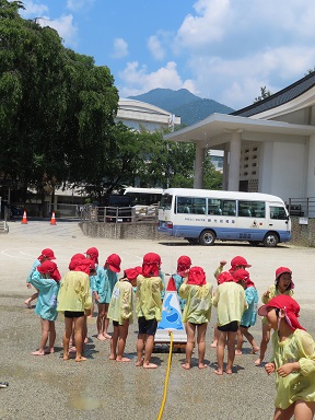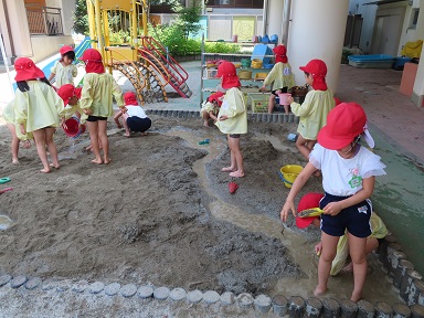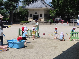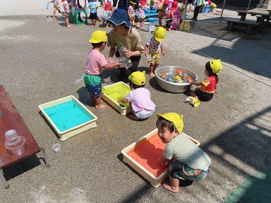 昨日の園庭は、クラス毎で、思い思いに水と親しみ、夏らしい遊びを楽しむ子どもたちであふれていました。